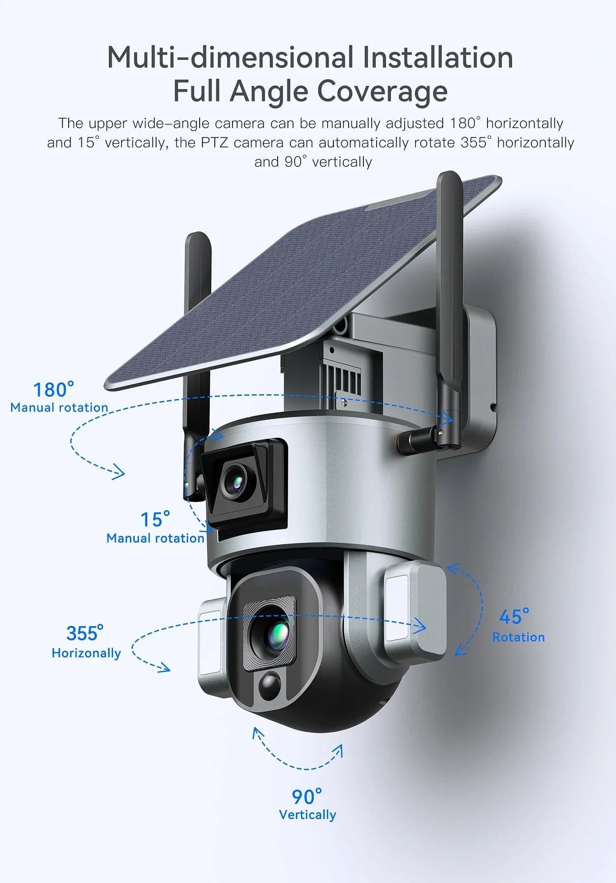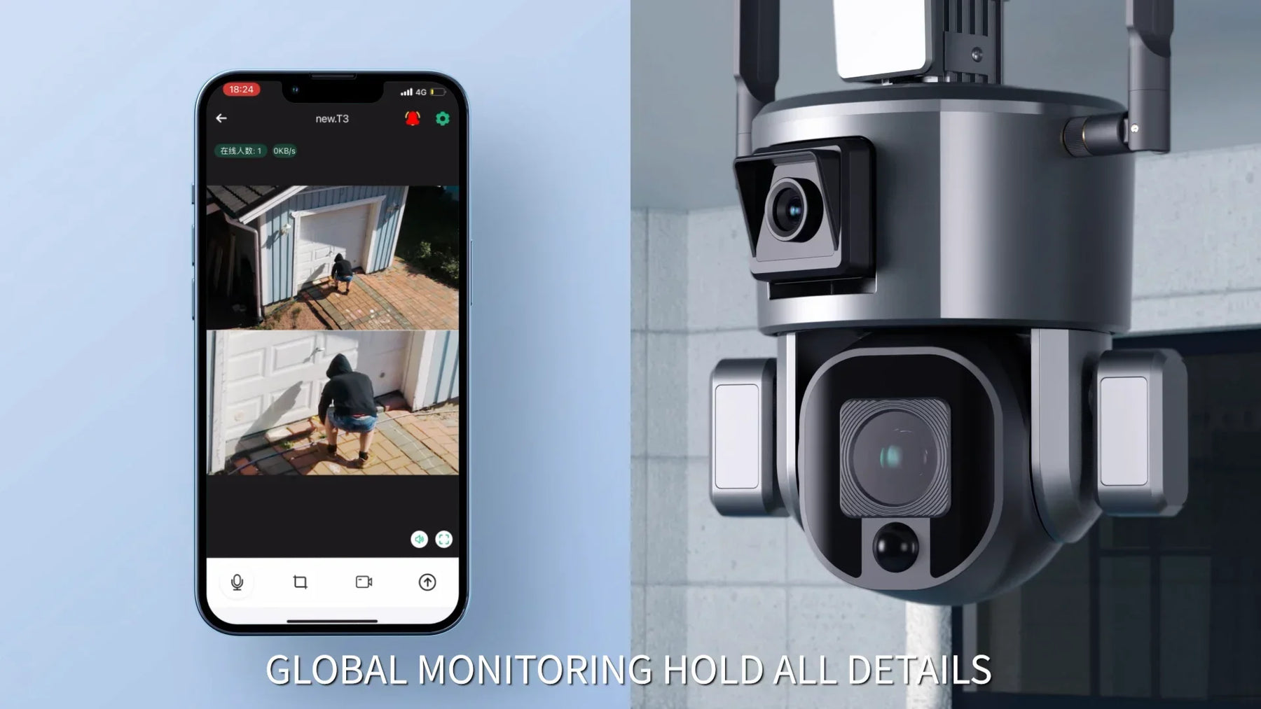 • Full HD 4MP+4MP video quality,Dual cameras monitoring.One camera for Wide angle global monitoring,One camera for PTZ detailed